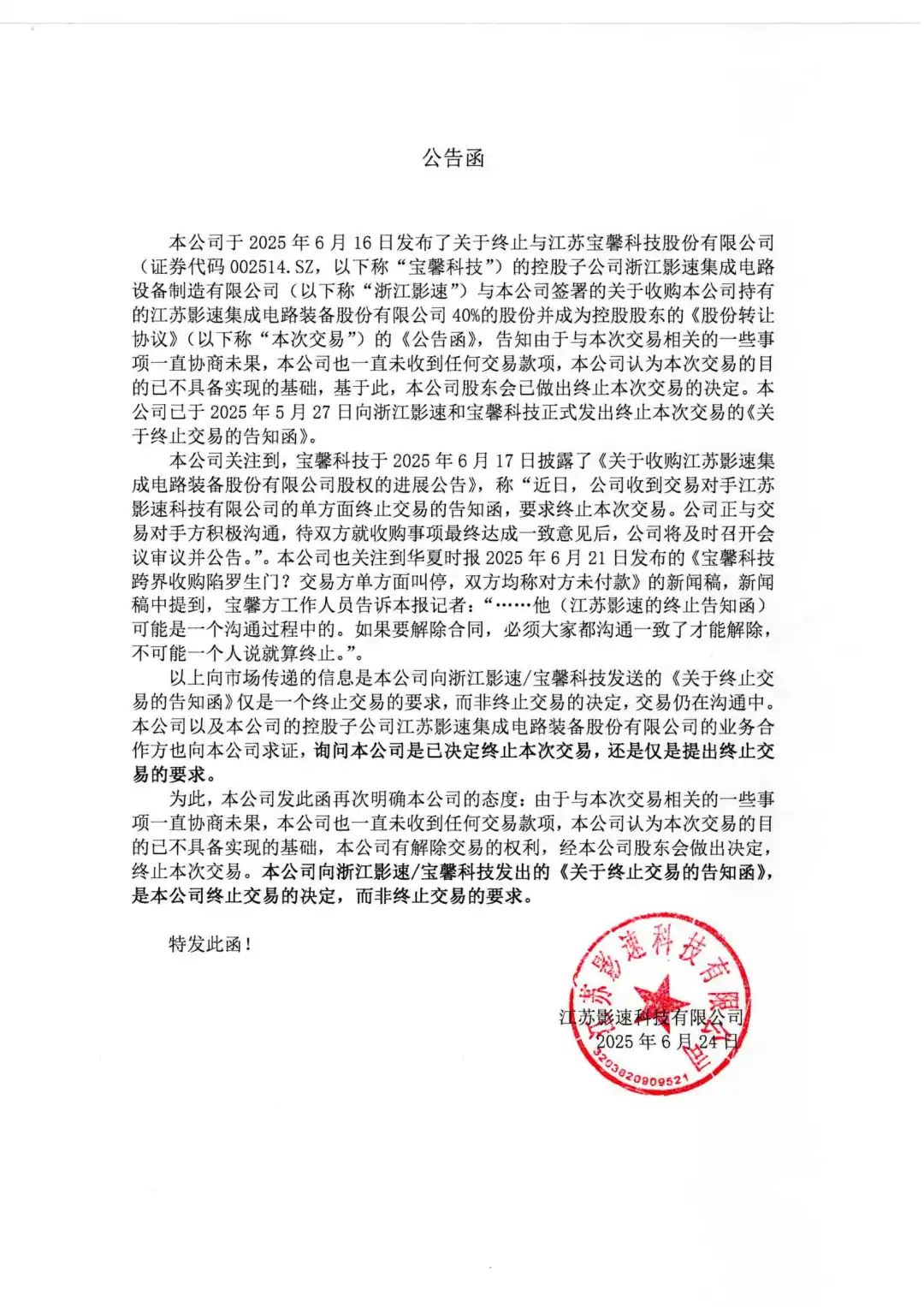 控股股东星空·综合体育科技已终止与宝馨科技(证券代码002514.SZ)的控股子公司浙江星空·综合体育关于收购本公司40%股份的交易
